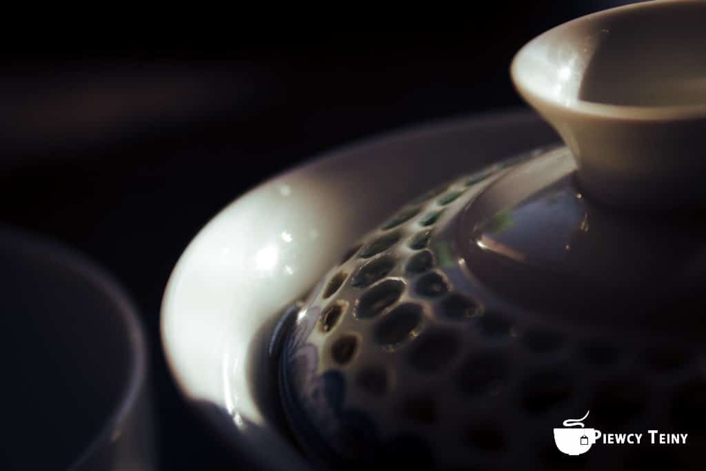 Przygotowałam litr wody o temperaturze około 90 stopni (następnym razem spróbuję parzenia wyższą temperaturą). Wykonałam sumarycznie około 8 parzeń w gaiwanie 100 ml przy użyciu gong dao bei (cha hai, puchar sprawiedliwości), gęstego sitka by sprawdzić czy dużo jest drobnych skruszonych elementów i czarki.